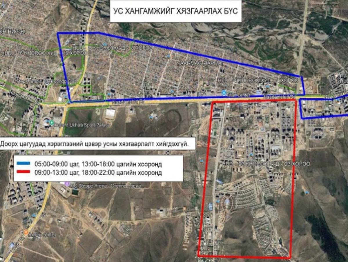 Хэсэгчлэн ус хаах хэсэгт “Food City” худалдааны төвөөс баруун тийш “Нүхтийн ам” хүртэл, замын хойд талдаа “Мөнх Хадаа”-аас Нисэхийн тойрог хүртэл суурьшлын хэсэг хамрагдах юм.